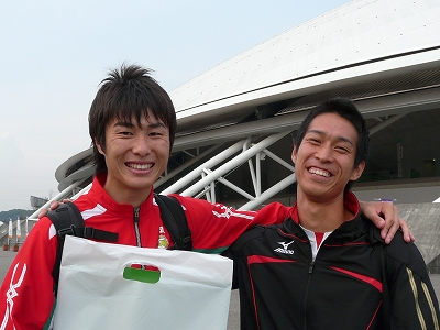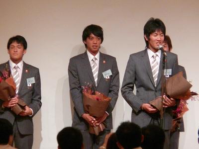 楊井選手には表彰を待つ間に話を聞いたのですが、隣には北京五輪代表の斉藤仁志選手。斉藤選手は3年生ですが、一浪していますから同い年。一緒の写真もいいかな、と思って撮らせてもらったのが