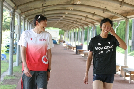 ウィグライプロスペシャル 第7回 ロンドン五輪直前特集 高平慎士&高瀬慧 編 200m代表コンビのクロストーク 対照的な成長過程の2人がロンドンで描く軌跡 200mのロンドン五輪代表の高平慎士と高瀬慧。同じ富士通所属で、出身大学も順大で同じである。背格好も似通っている2人だが、それぞれの成長過程は大きく異なる。先輩の高平は20歳でアテネ五輪に出場し、4×100mR銅メダリストとなった前回の北京五輪を経て、ロンドン五輪を短距離最年長選手として迎える。それに対し高瀬は24歳のシーズンで出場する今回が初五輪。日本の一線に躍進してわずか2年目である。2人に成長過程の違い、お互いの関係の変化を語り合ってもらうことで、それぞれの特徴とロンドン五輪の位置づけが明確になった。 ●急成長の背景 昨年の東日本実業団で20秒53の日本歴代10位(当時)をマークして日本のトップレベルに浮上した高瀬。テグ世界陸上は4×400mRのみの出場となったが、今年の日本選手権は200mで優勝して個人種目でもロンドン五輪代表入りを決めた。表2にあるように3年前の大学3年時には21秒が切れなかった選手。高平と比べると、五輪代表入りでいえば、ちょうど1サイクル(4年)違うのである。逆にいえば、ここ数年で急成長した。それを先輩の高平はどう見ていたのだろう。そして、高瀬自身はどう分析しているのか。 高平 大学の後半で何かをつかんだのだと思います。動きもはまっている感じが出てきて、スムーズに進むようになりました。本当に一気に来ましたからね。400m寄りのメニューでしたが、坂などの冬期練習では苦しいところで率先して前に出ていました。最近はケガもしなくなって、やりたい練習ができるようになったのが大きいと思います。体が太くなって安定感が出てきました。結果が出るに伴って意識レベルも上がってきた。日本のトップ、国際大会の代表というところを明確に目標にし始めたのが見ていてもわかりましたね。 高瀬 大学の後半から、何をやったらいいのかがわかってきました。大学3年の関東インカレがターニングポイントでしたね。予選で肉離れをしたことで、それまで漠然としていた考えが明確になってきたんです。ウエイトや補強に積極的に取り組み始めて、それらをどう走りに結びつけるかを考え、そして走り自体のコツもつかめてきました。ケガも減ってきて、タイムも伸びて、陸上が面白くなってきました。1、2年の頃は何をやったらいいのかわからなかったし、タイムも出なくて先が見えていませんでした。コーチや先輩たち、周りの人たちがアドバイスをしてくれたおかげで気づくことができたんです。 表1 高平と高瀬のプロフィール比較 高平慎士 項目 高瀬慧 10秒20(+1.3)2009年 100m 10秒43(−1.5)2012年 20秒22(+1.3)2009年 200m 20秒42(±0)2012年 46秒01・2003年 400m 46秒46・2010年 1984年7月18日 生年月日 1988年11月25日 北海道 出身 静岡県 旭川六合中 中学 長田南中 旭川大高 高校 静岡西高 順大 大学 順大 富士通 実業団 富士通 A型 血液型 O型 180cm 身長 179cm 62kg 体重 62kg 27.5cm シューズ 26.5cm 91cm 股下 不明 240cm前後 最大ストライド 不明 既婚 婚姻 独身 ●2011年と2012年の違いは精神面 今季の高瀬は、記録の伸び幅は昨年ほど大きくはないが、何かがまた違っていた。昨年はシーズン日本2位の記録を持ちながら、日本選手権は5位と敗れて個人種目の世界陸上代表を逃した。今年は前述のように日本選手権を勝ちきった。高瀬自身は昨年との違いをどう自己分析し、高平は成長し続ける後輩にどんな期待をかけているのだろうか。 高瀬 精神面の成長があったと自分では思っています。去年の日本選手権は舞い上がってしまって自分の走りができませんでした。東日本実業団でタイムを出して、高平さんにも勝てるんじゃないかと周りから言われて、変に意識をしてしまったんです。大学4年の冬期練習は“世界陸上を走りたい”とは思ってやっていましたが、“行ければいい”くらいの気持ちでした。そんな考えでは、日本選手権を走る覚悟が足りないのは明白です。その結果が前半だけ突っ込んで、後半で脚が止まる走りしかできませんでした。 テグ世界陸上をリレーで経験して、やっぱり個人で出ないとダメだと痛感しました。世界に目を向けられるようになったのが大きかったです。今年は勝負を意識しすぎず、自分の走りに集中できました。 あとは練習での走り方も変えましたね。レースの3、4日前にタイムトライアルをしますが、昨年までは力んでいて後半で相当にきつくなっていました。つねに100%を出そうとしたことがマイナスに働いてしまったんです。それを今年は80%で走る練習を多くして、レース前の刺激もマックスを出さないようにしました。昨年の練習の方がタイムは速いのですが、今年の方が感覚は良い。練習の幅が広がったと感じています。 僕の中では大学3年の関東インカレまでが成長の第1段階で、昨年の日本選手権までが第2段階、今は第3段階に入っていると位置づけています。 高平 陸上